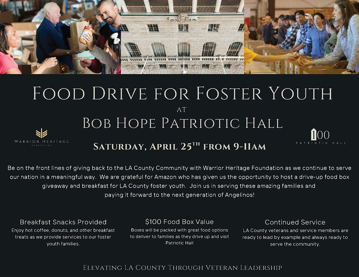 Be on the front lines of giving back to the LA County Community with Warrior Heritage Foundation as we continue to serve our nation in a meaningful way. We are grateful for Amazon who has given us the opportunity to host a drive-up food box giveaway and breakfast for LA County foster youth. Join us in serving these amazing families and paying it forward to the next generation of Angelinos!
