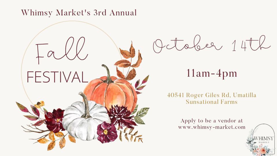 Come out to the farm and enjoy our 3rd annual Fall Festival at Sunsational Farms. There will be over 90 small business vendors, pumpkin patch, food trucks, a DJ, bounce houses, games & more! *FREE ADMISSION & PARKING