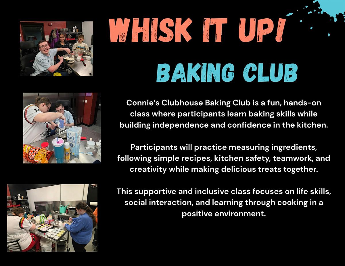 Whisk It Up: Baking Club is a hands-on, inclusive class where individuals of all abilities learn real-life cooking and baking skills in a fun, supportive environment.