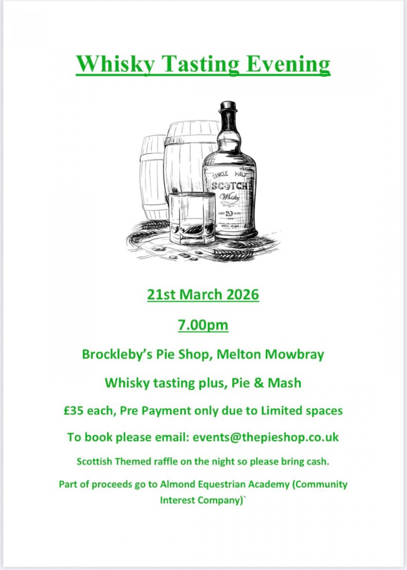 Join us for a fantastic evening of whisky tasting, where you’ll sample a range of carefully selected whiskies while being expertly guided through each one. Midway through the event, you’ll also be treated to a delicious slice of Brockleby’s Pie & Mash.