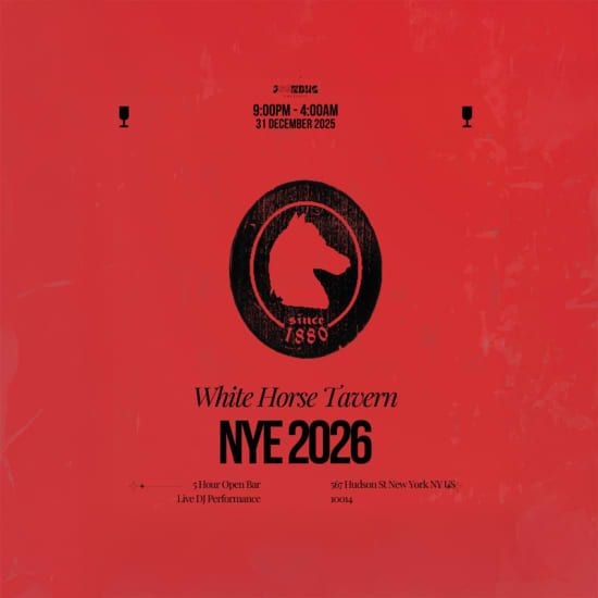 Highlights 🍸 5-hour premium open bar for nonstop festive vibes 🎶 Live DJ spinning Hip Hop, Top 40 & Dance hits all night 🥂 Midnight champagne toast & DJ-led countdown celebration General Info 📅 Date & Time: December 31, 2026 – Time MISSING 📍 Location: White Horse Tavern, 567 Hudson St, New York, NY 10014 👤 Age requirement: 21+ with valid ID 👗 Dress code: Festive - Casual Evening / Semi-Formal Attire Description Step into West Village charm this New Year’s Eve at White Horse Tavern, NYC’s iconic and second-oldest continuously operated tavern. Celebrate in literary legacy and historic ambiance while enjoying a 5-hour premium open bar, a live DJ spinning Top 40, Hip Hop, and Dance hits, and a thrilling champagne toast at midnight. Elevate the night with VIP packages offering exclusive seating and bottle service. Get your tickets for White Horse Tavern NYE 26 NYC now!
