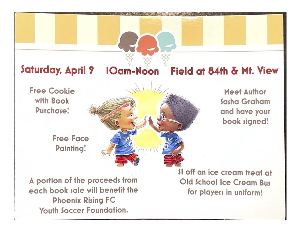 Join us in supporting local soccer youth scholarships and enjoy ice cream from Old School Ice Cream Bus, face painting, and raffle to win a Tiny Ninja Books prize pack! Meet the author, get your books signed, and take photos with Whitney cut-outs! Free cookie with purchase of Whitney Wins Everything. *A portion of the proceeds from the day’s book sales will benefit the Phoenix Rising FC Youth Soccer Foundation*