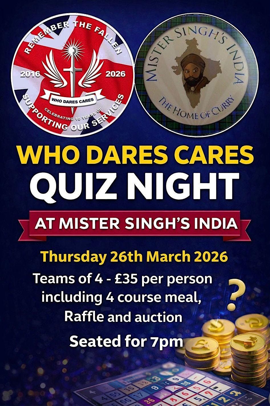 Join Who Dares Cares for a fantastic Quiz Night at Mister Singh’s India in support of our Armed Forces and blue-light community.
