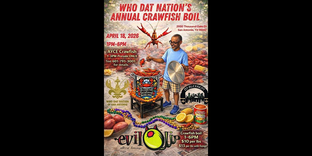 Get ready for some serious fun at the Who Dat Nation Annual Crawfish Boil! Join us at Evil Olive on April 18, 2026 at 12:00 PM (Central Time) for a laid-back day filled with delicious crawfish, great music, and awesome vibes. Whether you're a crawfish pro or a first-timer, this is the perfect chance to kick back, mingle, and enjoy some tasty eats with the crew. Enjoy AYCE crawfish during a 1–3PM PRESALE ONLY (text 601-791-3001 for details), or grab crawfish by the pound $10/lb or $13 with fixings. Don't Miss Out!!! Good food, good music by DJ Blessed 1, and true Nola vibes all day.