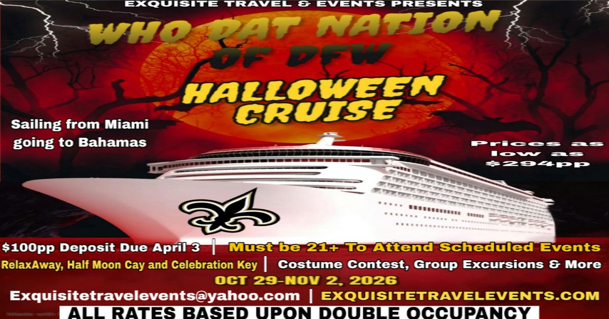 Get ready for a spooky good time at the Port of Miami on October 29, 2026 at 8:00 AM (Eastern Time)! Join the Who Dat Nation of DFW for a fun-filled Halloween cruise. Whether you're in costume or just down to vibe, this is the perfect way to celebrate with friends and fellow fans. Don’t miss out on the laughs, music, and great company. Halloween party and group excursions will be planned. See you there!