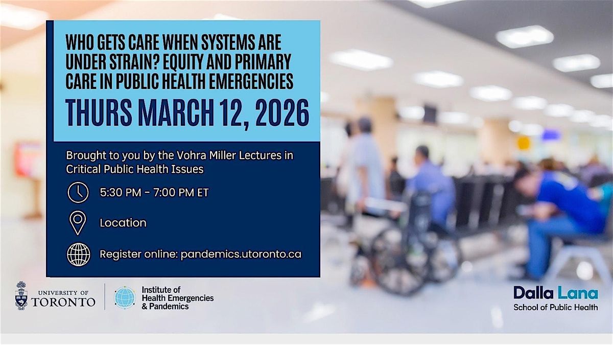 The sixth-annual Vohra Miller Lectures in Critical Public Health Issues, in collaboration with the Institute of Health Emergencies and Pandemics aims to foster a dialogue on how intersecting forms of oppression—such as race, disability, and immigrant status—compound the challenges faced by these groups in Ontario when trying to access primary care during health emergencies. We will explore the structural barriers that hinder their access to healthcare, rehabilitation, and social services, while discussing the broader impacts on mental health, access to care, and economic stability. The discussion will propose strategies that contribute to the creation of a more inclusive and equitable healthcare system.
