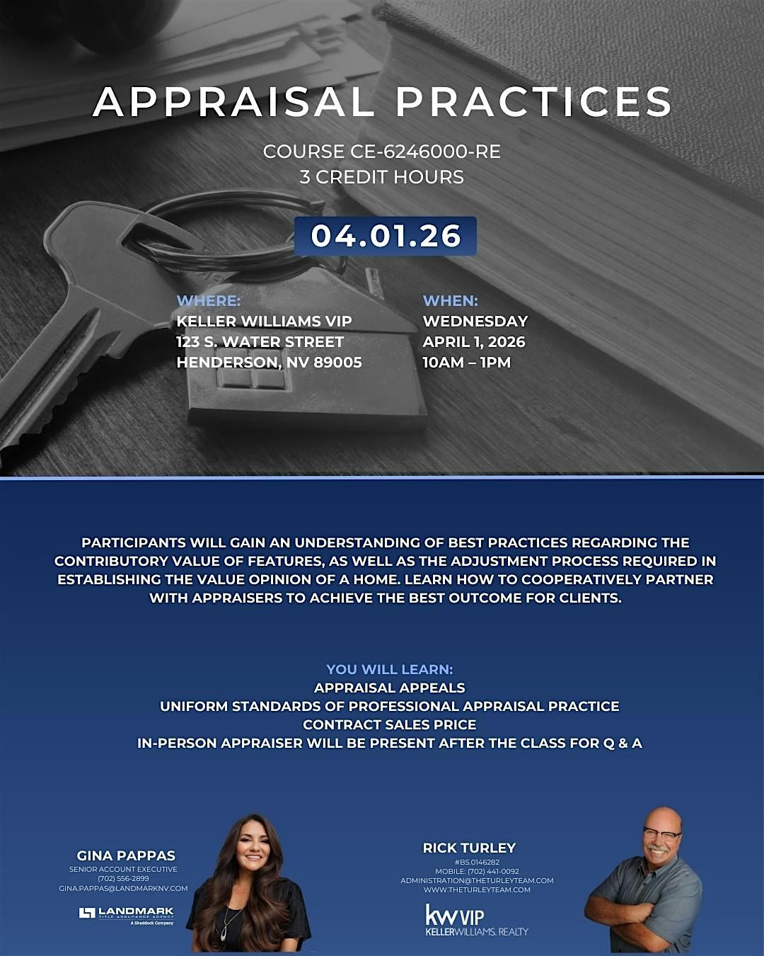 Join us April 1, 2026 at 10:00 AM for a fun and easy way to earn 3 CE hours while diving into the latest in appraisal practices. This in-person event will be held at Keller Williams VIP - 123 Water Street Henderson, NV 89015. Don't miss out on this chance to learn, network, and boost your skills in a relaxed setting!