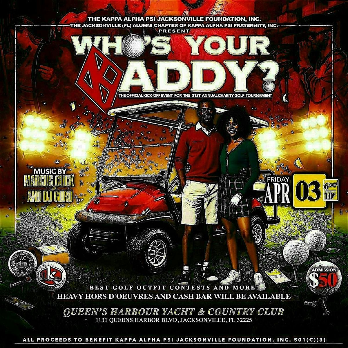 Come celebrate with the Nupes at their kickoff event for the 31st Annual Charity Golf Tournament in your golf chic attire and vibe to the musical stylings of Marcus Click and DJ Guru! Heavy Hors d'oeuvres will be served and a Cash Bar will be available. A Best Golf Outfit Contest will be held as well as a chance to win Cash in the 50/50 raffle and more! You don't want to miss this event! All proceeds to benefit the Kappa Alpha Psi Jacksonville Foundation, Inc. 501(c)(3)