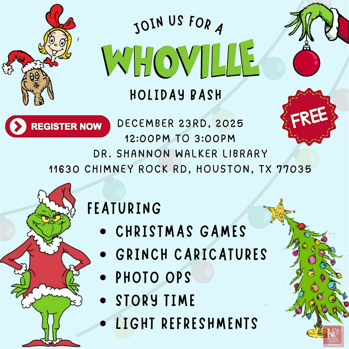 Get ready to jump into the festive spirit at the Whoville Holiday Bash! Join us in person for a day full of fun activities, holiday crafts, and lots of Whoville cheer right here at the Houston Public Library. Whether you're a fan of Dr. Seuss or just looking for a cool way to celebrate, this event is packed with joy and laughter. Bring your friends and family and make some magical holiday memories with us!