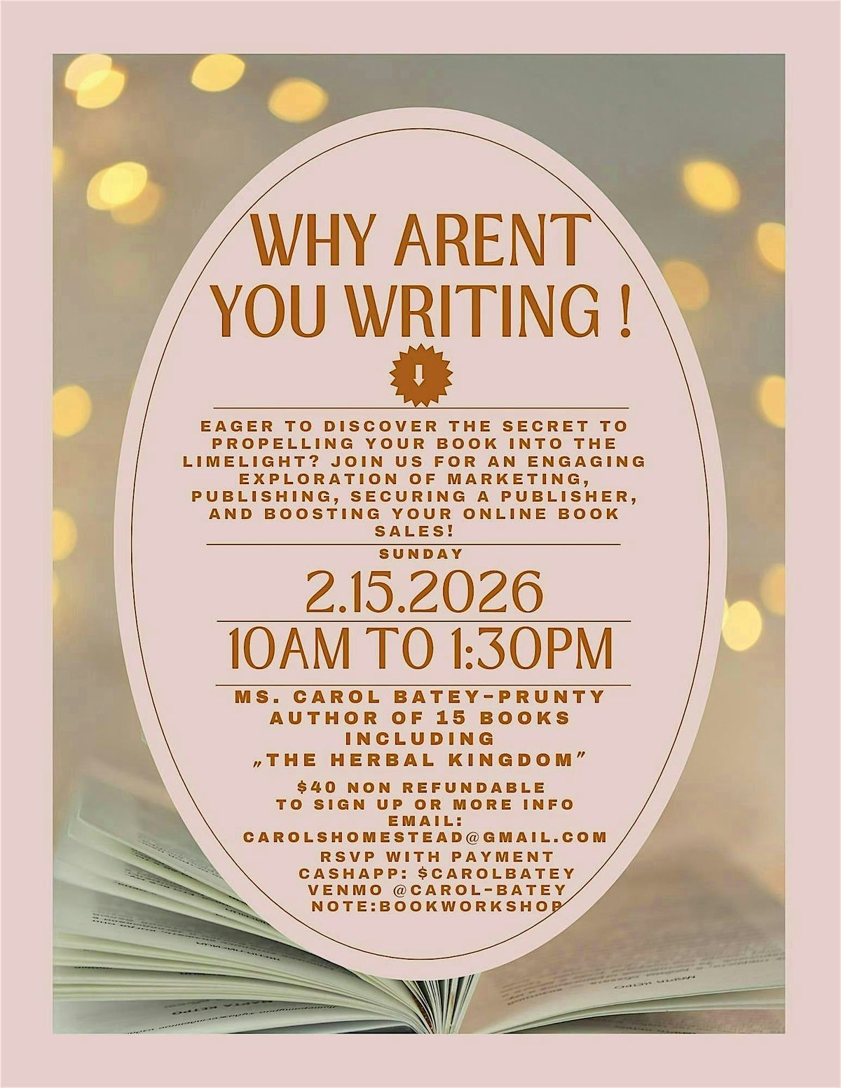 Join us in person for an engaging exploration of marketing, publishing, securing a publisher, and boosting your online book sales! Ms. Carol Batey-Prunty (Author of 15 books, including The Herbal Kingdom) hosts this life-affirming session. Bring your ideas, your questions, and your favorite pen—let's get those words flowing together!