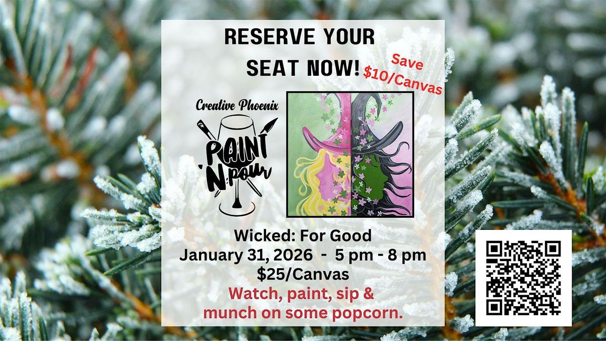 Join us for Wicked: For Good, a unique watch party painting event! Watch the beloved Wicked movie while creating your own painting of Glinda, Elphaba, or the iconic pair. Whether you’re drawn to the bubbly Glinda, mysterious Elphaba, or want to capture their magic together, this class is all about fun and imagination.