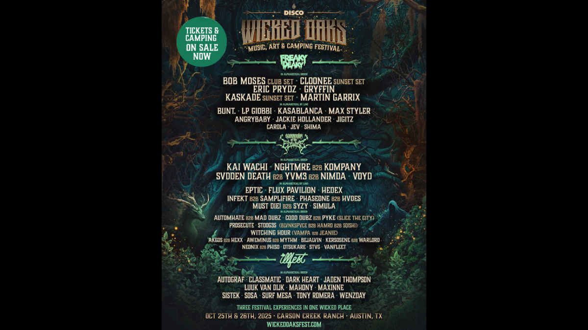 š Location: 30.2284, -97.6611š Prepare to be amazed at Wicked Oaks Music Festival - (2-Day Pass) with Bob Moses (club set), Eric Prydz, Cloonee, Gryffin, and more!, the most anticipated gathering of the season! š Set against the stunning backdrop of Carson Creek Ranch in vibrant Austin, TX, this event promises to redefine your expectations. š Mark your calendars for October 25th, 2025 at 08:30 AM and get ready to immerse yourself in an atmosphere of wonder and excitement. ⨠From the moment you arrive, you'll be transported into a world where memories are made and stories come alive. They have crafted an experience that perfectly harmonizes entertainment, innovation, and community spirit. š Join us as we create moments that will be discussed for years!
