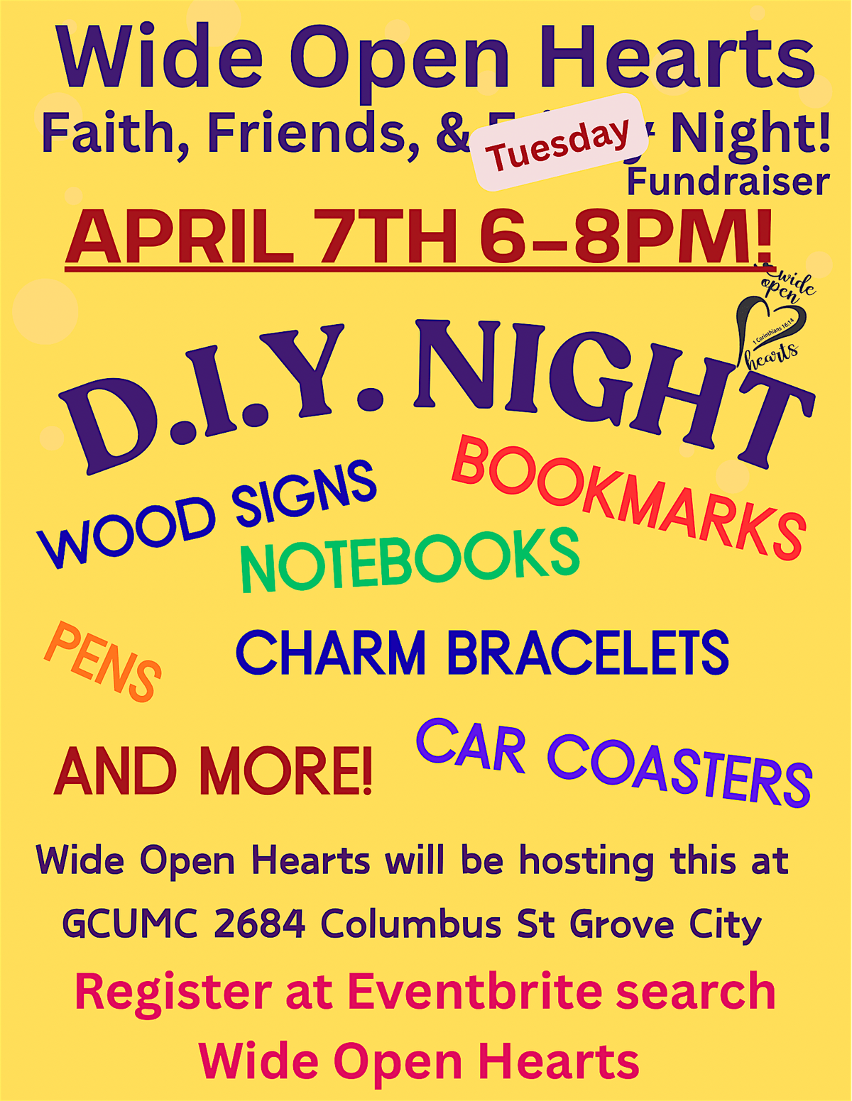 We normally do Faith, Friends & Friday Night but in April we are doing Tuesday night 4/7. Our D.I.Y. Fundraiser is an opportunity to hang out with friends and make new ones, while putting your personal touches on items. Proceeds benefit Bags of Hope, combating childhood food insecurity.