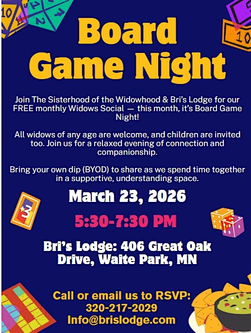 Join The Sisterhood of the Widowhood & Bri’s Lodge for our FREE monthly Widows Social — this month, it’s Board Game Night!