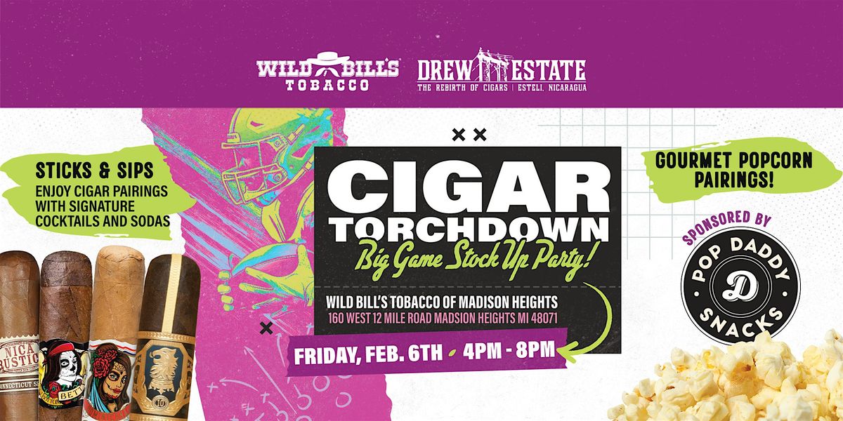 Wild Bill's Cigar Torchdown! Join us at Wild Bill's Tobacco in Madison Heights Michigan for our big game stock up party. This special event is a perfect way to get together for the weekend and stock up with big offers! Our newly remodelled lounge is ready to kick off the big game weekend with new event experiences.
