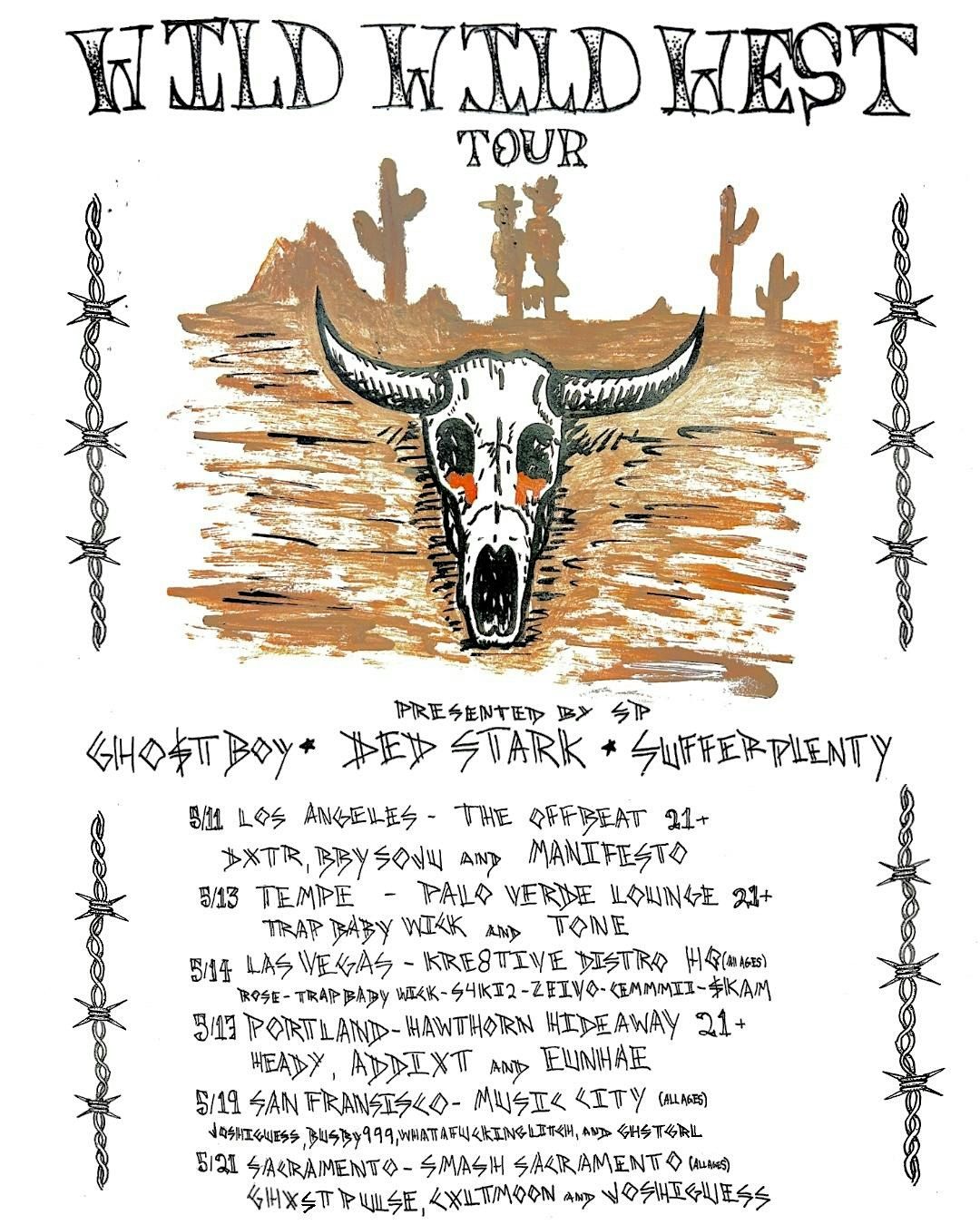 Wild Wild West Tour: GHO$TBOY, Ded Stark, sufferplenty, ghstgrl, TONE and trapbabywick at palo verde lounge in tempe AZ May 13th doors 7pm show starts 8pm $12 advance and $15 at doors.
