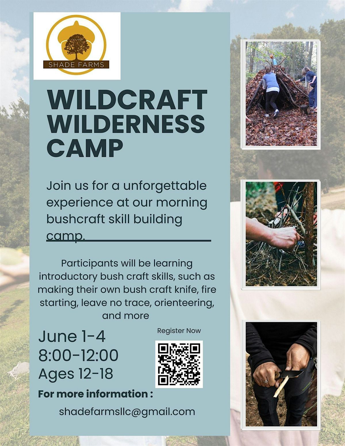 Participants will be learning introductory bush craft skills, such as making their own bush craft knife, fire starting, leave no trace, orienteering, and more