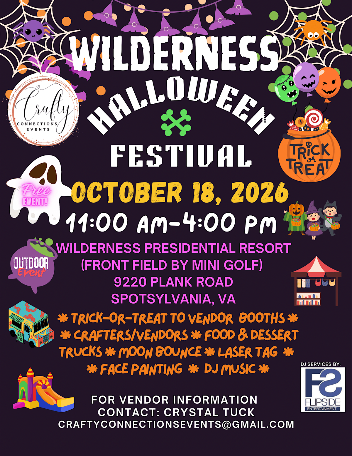 Get ready for a spooky good time at the Wilderness Halloween Festival! Join us on October 18, 2026 at 11:00 AM (Eastern Daylight Time) at the Wilderness Presidential Resort. Expect fun costume contests, trick or treating to our vendors, and a great food. Bring your friends and family for a day full of laughs and Halloween spirit. Don’t miss out on this awesome event!