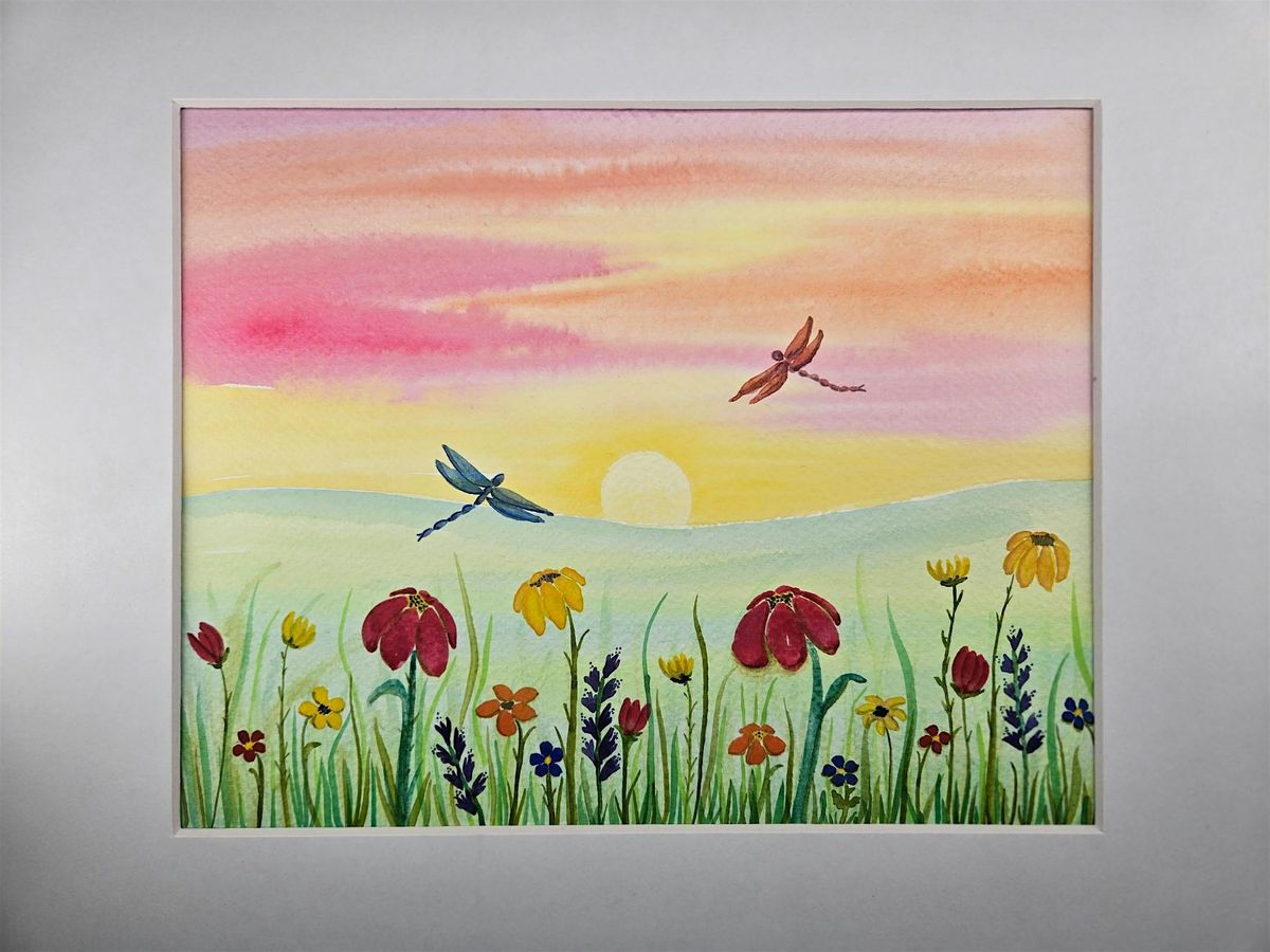 Join talented artist Janie Lew as she guides you step-by-step in creating a cheerful wildflower landscape—complete with soft sunset skies, whimsical blooms, and even a flutter of dragonflies! This beginner-friendly class is perfect for anyone ready to relax, play with color, and let their creativity bloom.