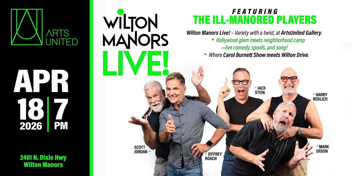 Step into the spotlight with Wilton Manors’ newest variety show! Starring The Ill-Manored Players: Mark Erson, Scott Jordan, Jeffrey Roach, and Jack Stein. Inspired by The Carol Burnett Show, we bring you a night of sketch comedy, music, spoofs, and audience fun—served up with plenty of local flair. Every month at Arts United Gallery, join us for an evening where the laughter is live, the talent is local, and anything can happen.