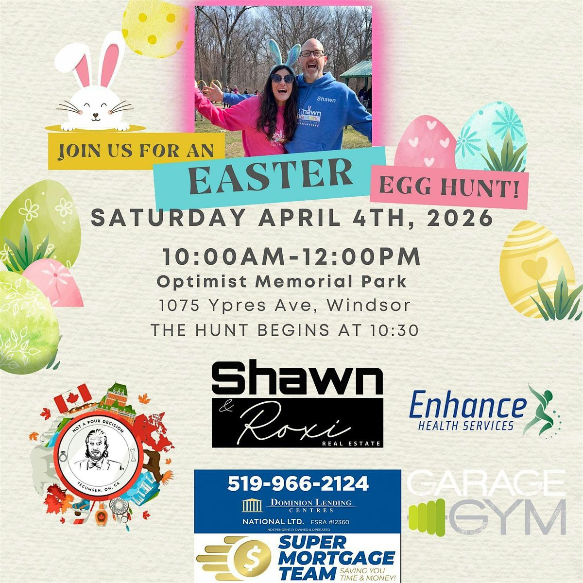 The Shawn and Roxi Real Estate Team are proud to bring the easter bunny to all of our friends and family again this year. Join us for a massive egg hunt where every child will leave with a bag of treats. There will be food and refreshments for everyone in attendance, games, activities, and so much more. We ask that you please help someone in need and bring some non perishable food items for our local food bank. Together we can all make a differnce and have a great time together.