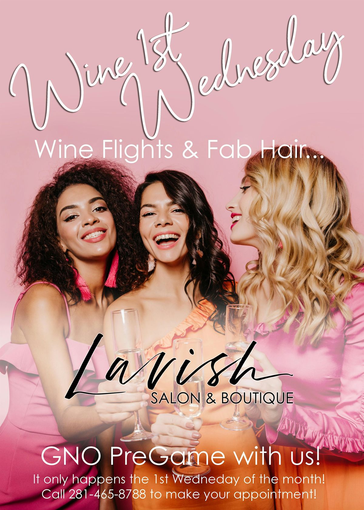 Enjoy a custom wine flight and charcuterie board while getting your hair done! You don't want to miss this! It only happens once a month! Call and book your appointment at 281-465-8788 or go online to www.lavishthewoodlands.com to book online!