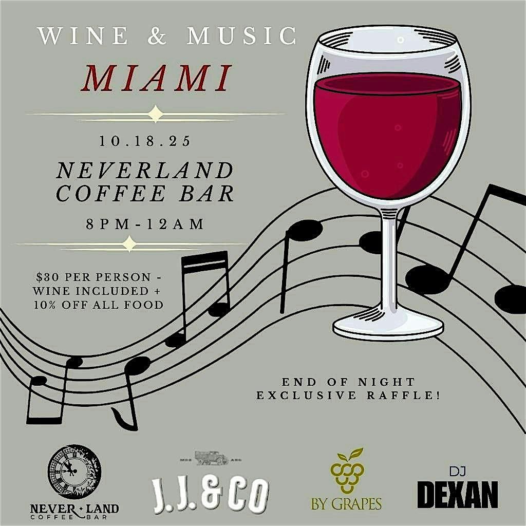 Welcome to Wine & Music Miami event! Join us for a fantastic evening of live DJ music and delicious JJ&Co wine at Neverland Coffee Bar.