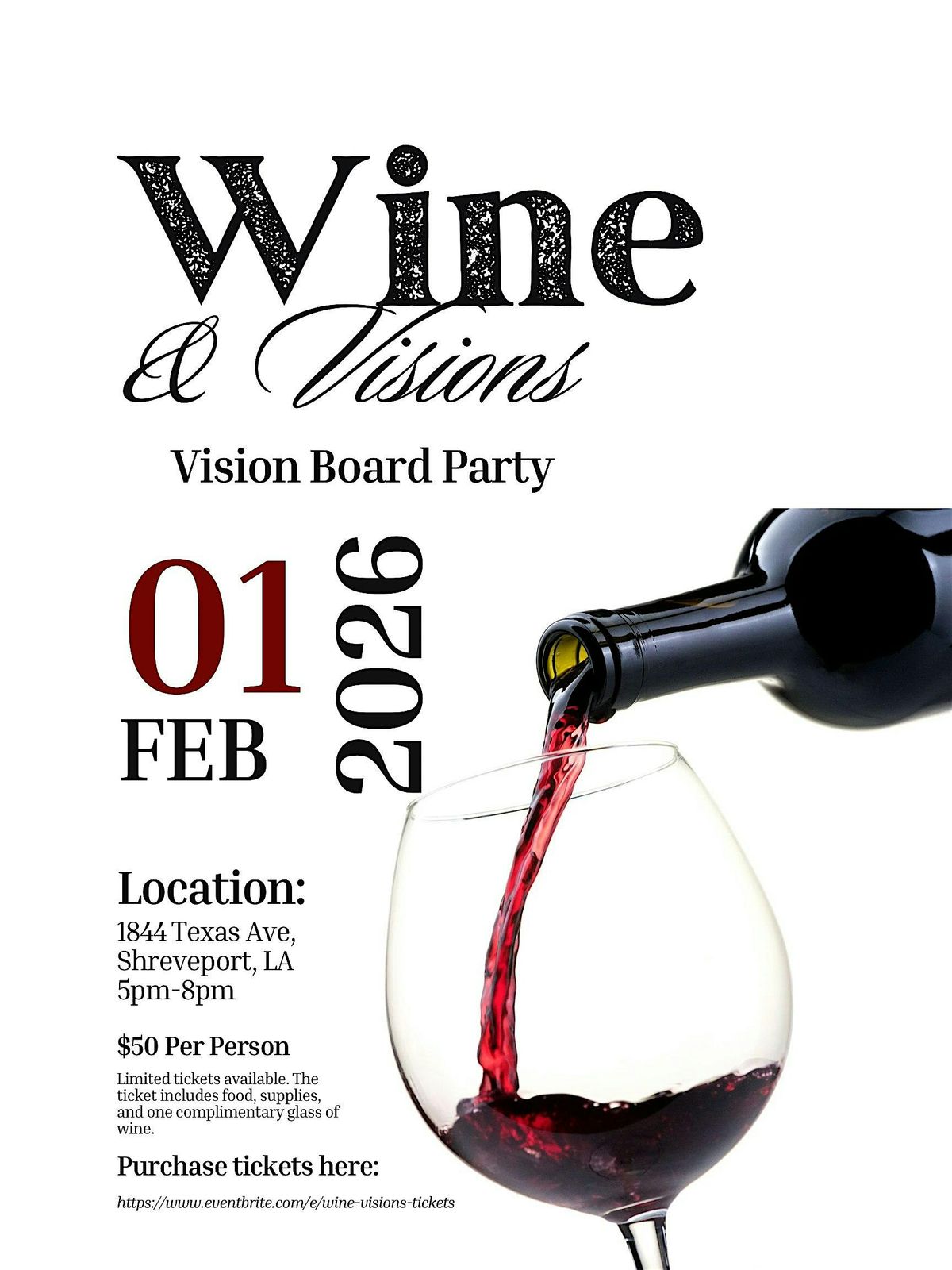 Wine & Visions is an intimate creative experience designed to help you slow down, reflect, and bring your goals to life. Join us for an evening of vision-board creation, good music, great energy, and a relaxed, inspiring vibe.