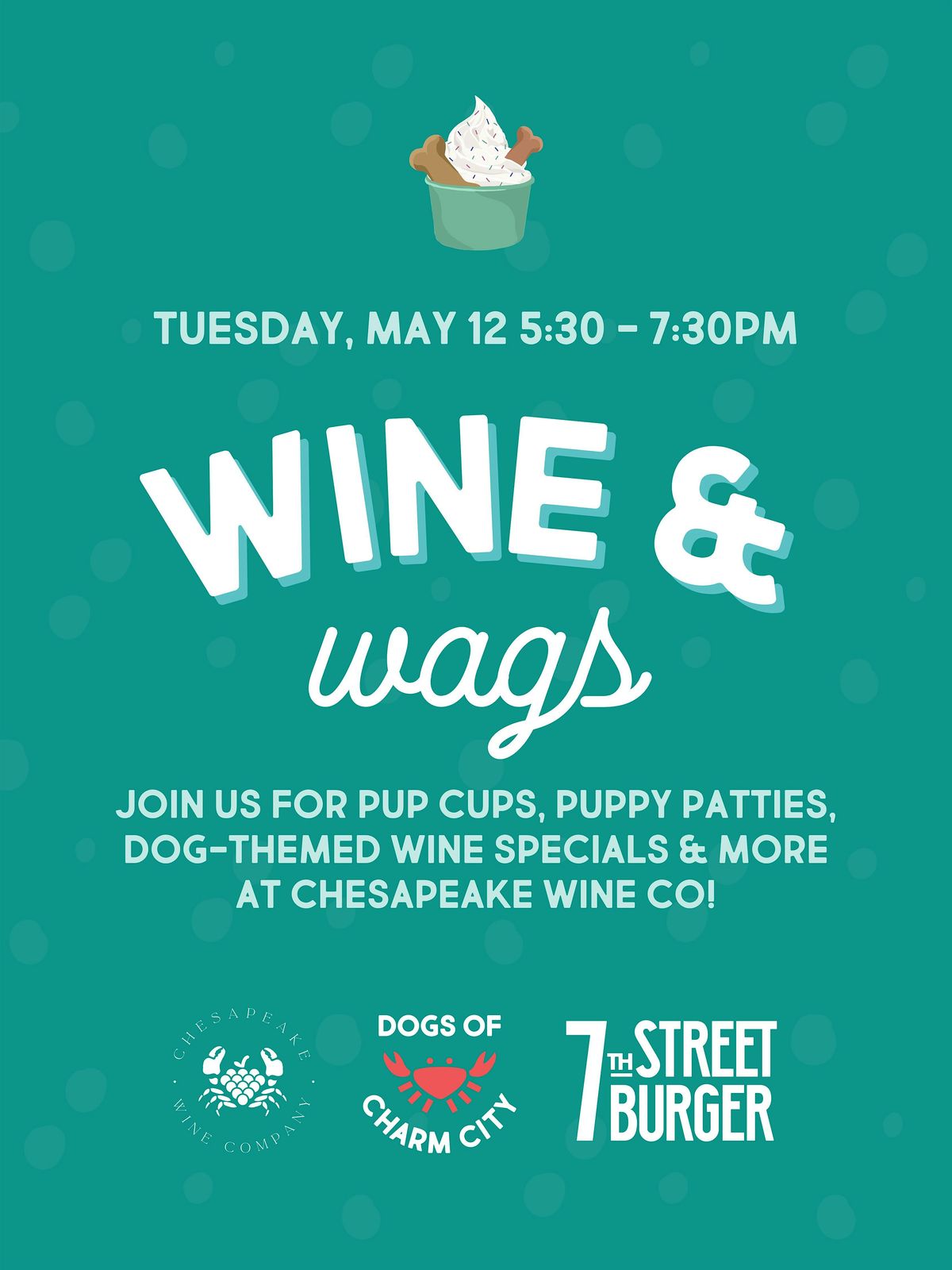 The Dogs Of Charm City will be onsite giving out Pup Cups, Our neighbors at 7th Street burger will be firing up Puppy Sliders, and Chesapeake Wine Co will have wine and beer specials for humans and maybe even some doggie wine too!