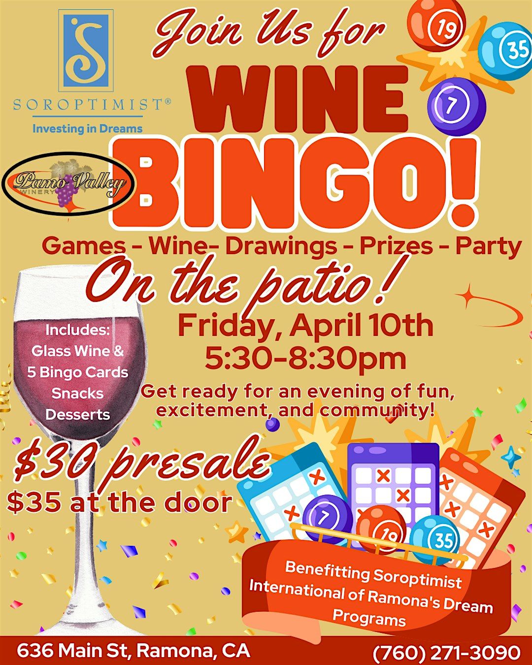 Get ready for a fun-filled evening of Wine Bingo in person! Sip your favorite wines, enjoy great company, and test your luck with bingo rounds designed to bring excitement and prizes. Perfect for a chill night out with friends or making new ones. Don't miss this chance to relax, laugh, and maybe even win some cool stuff. Cheers to good times and good vibes at Ramona Soroptomist!