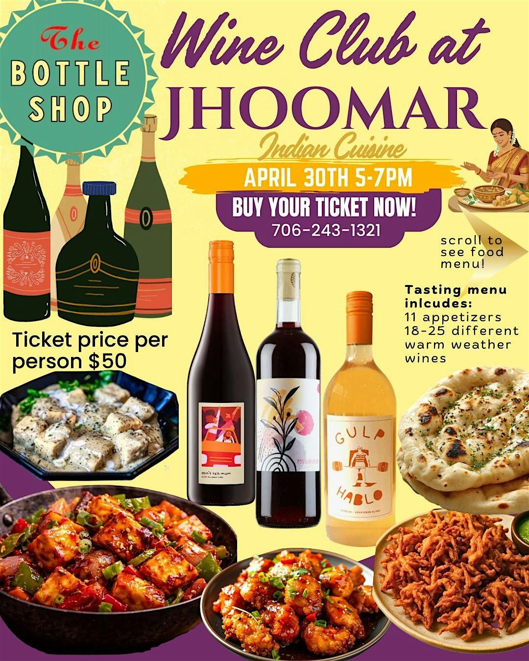 Come and try 11 appetizers & 18-25 warm weather wines with Jhoomar Indian Cuisine x The Bottle Shop!!! 5-7pm, April 30th!About this Event