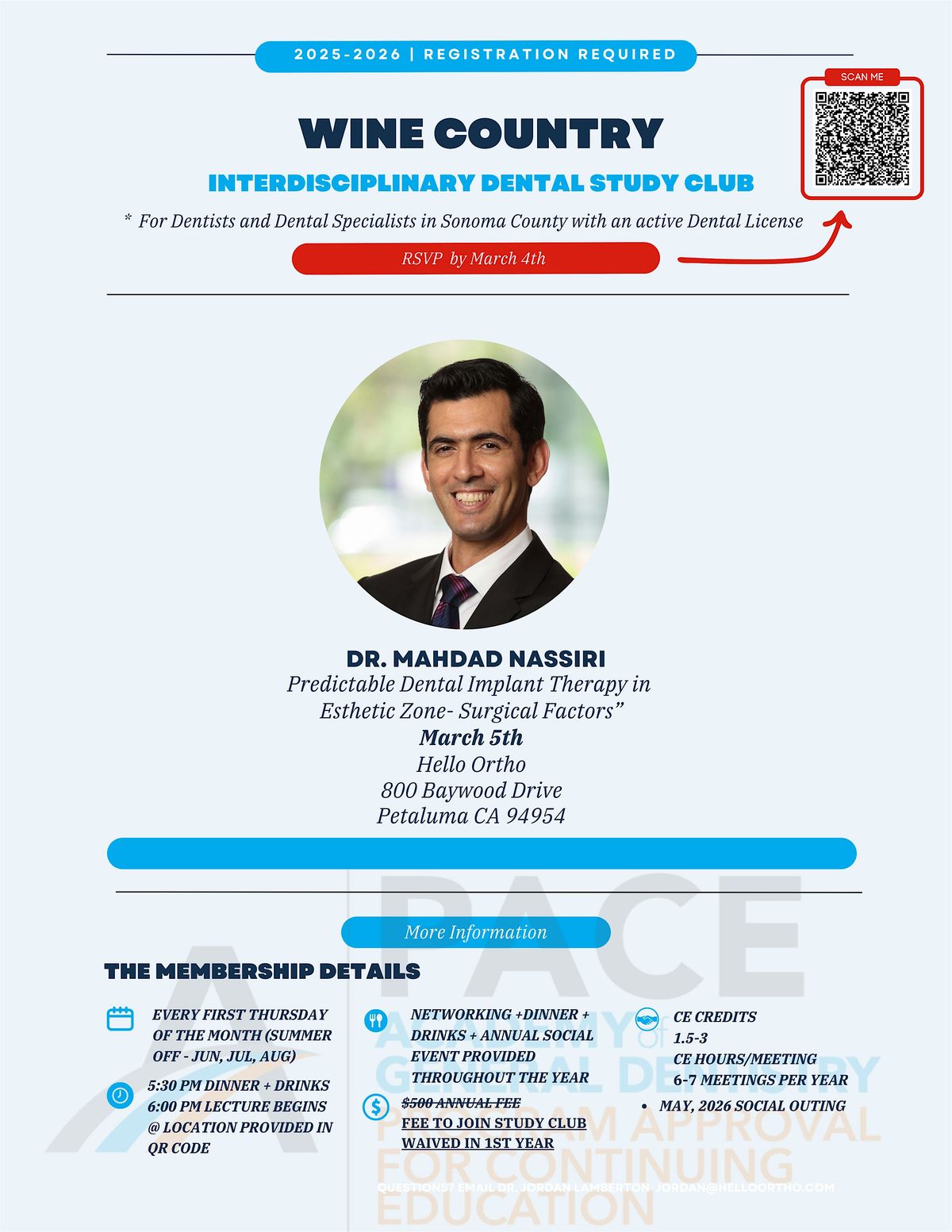 Join the Wine Country Interdisciplinary Dental Study Club for an engaging evening of continuing education, connection, and collaboration with Dr. Mahdad Nassiri.