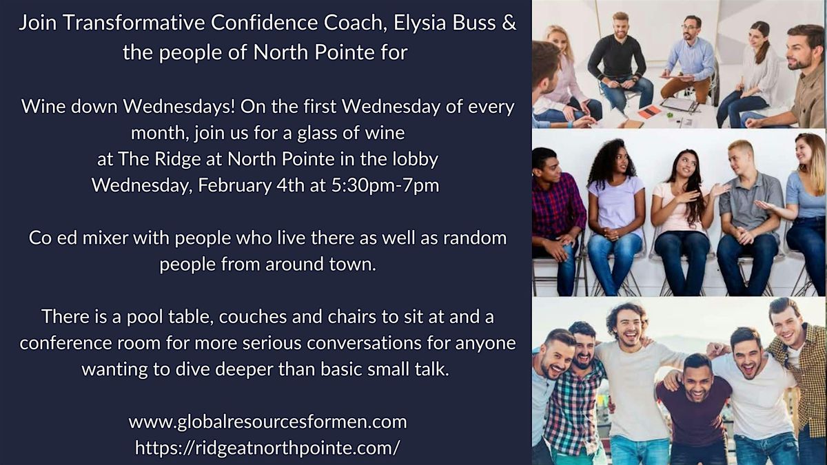 Are you ready for some fun?! I'm co hosting a co ed mixer! So ladies and gentlemen of the Charlottesville area, if you'd like to come have a glass of wine, some good conversation and maybe play some pool, then come join .me and the community of North Pointe for Wine Down Wednesdays, a relaxed yet intentional co-ed social mixer hosted on the first Wednesday of every month in the lobby at The Ridge at North Pointe.