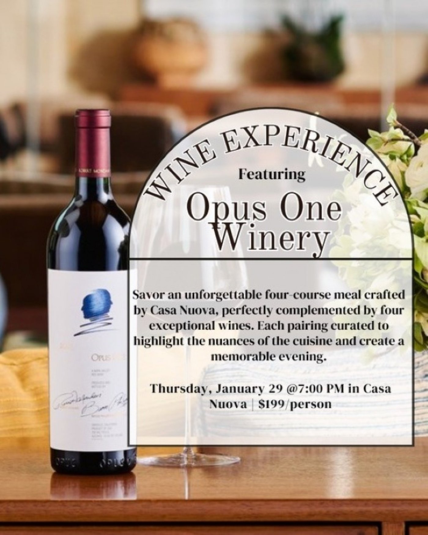 Join us for an unforgettable evening of fine dining and world-class wine at Casa Nuova Italian Restaurant. Enjoy an elegant four-course dinner thoughtfully crafted by our chefs and expertly paired with four exceptional Opus One wines, each selected to enhance the flavors of every course.