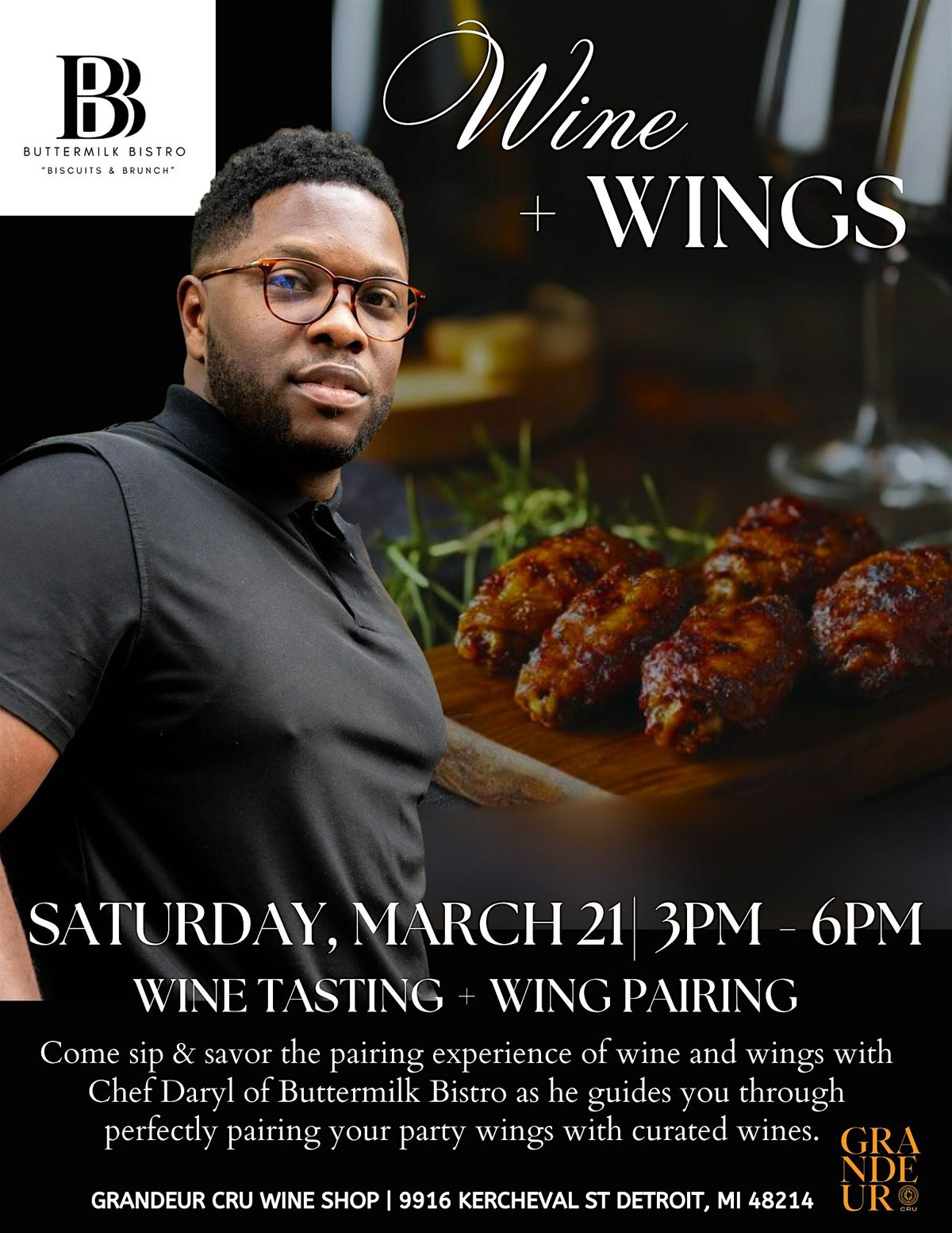 Featuring wing creations by Chef Daryl of Buttermilk Bistro bringing bold flavors, crispy perfection and unforgettable bites to pair with our curated wine selections.