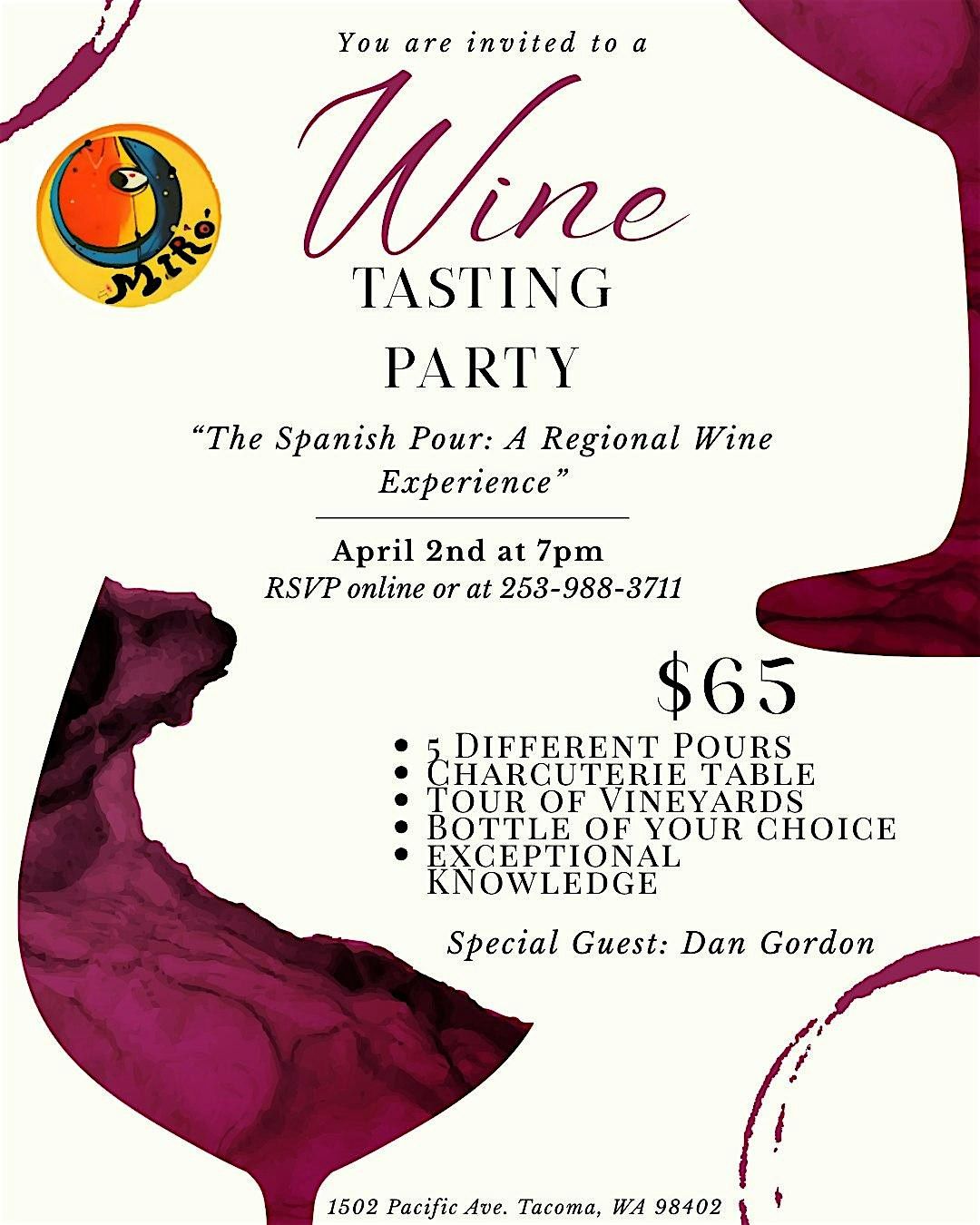 Enjoy five distinct Spanishg pours paired with a charcuterie spread, while specialk guest Dan Gordon shares insights into each region and varital. Each guest will also take home a bottle of their choice - making this the perfect night out for both wine lovers and the wine curious!