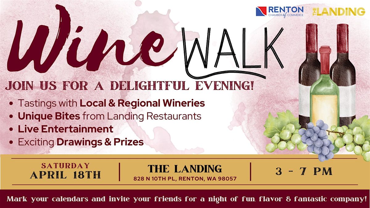 The Renton Wine Walk is the perfect event for wine connoisseurs or those just starting to discover the world of wine. Sample from regional & local wineries as you stroll through the Landing businesses and chat with the winemakers as they pour their select choices. "Secret Stops" along the way with food tastings, games & prizes. Music & entertainment along route - see live paintings, musicians and buskers of all types.
