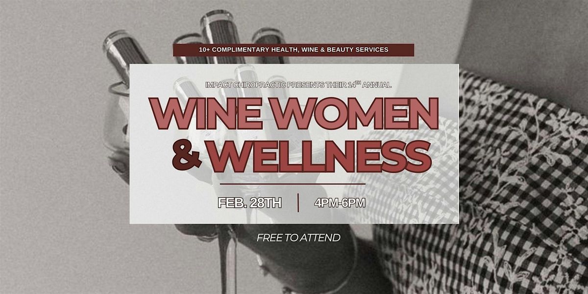 Come join us for our 14th annual Wine Women and Wellness event hosted by Impact Chiropractic. We feature all locally owned, (mostly) women owned businesses to pamper you for an evening. Try out 10+ complimentary vendor services from chair massage, to facial massage, chiropractic analysis, SoftWave therapy, nail polish change, acupuncture ear seeds, vitamin injections, and more!
