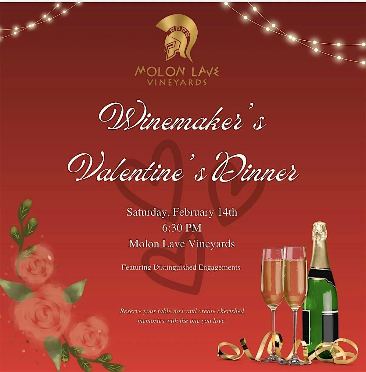 Roses are red. Violets are blue. This Valentine's Dinner is just for you! Join us for a four course meal prepared by Distingushed Engagements, alongside hand selected Molon Lave Vineyards wines! You'll be on cloud nine with your Valentine as you enjoy an evening of fine wine and food!