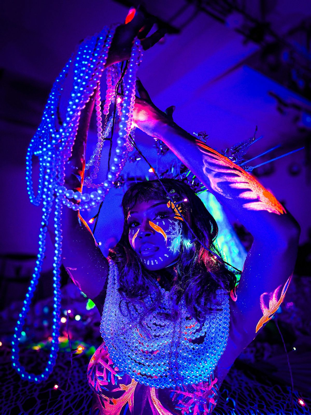 All designs and accessories are meticulously crafted by Jylle Navarro, an experienced artist with a strong focus on UV reactive materials and a background in multi-disciplinary art spanning several years. Her expertise is reflected in the unique and captivating designs that contribute to the extraordinary Neon Naked experience.