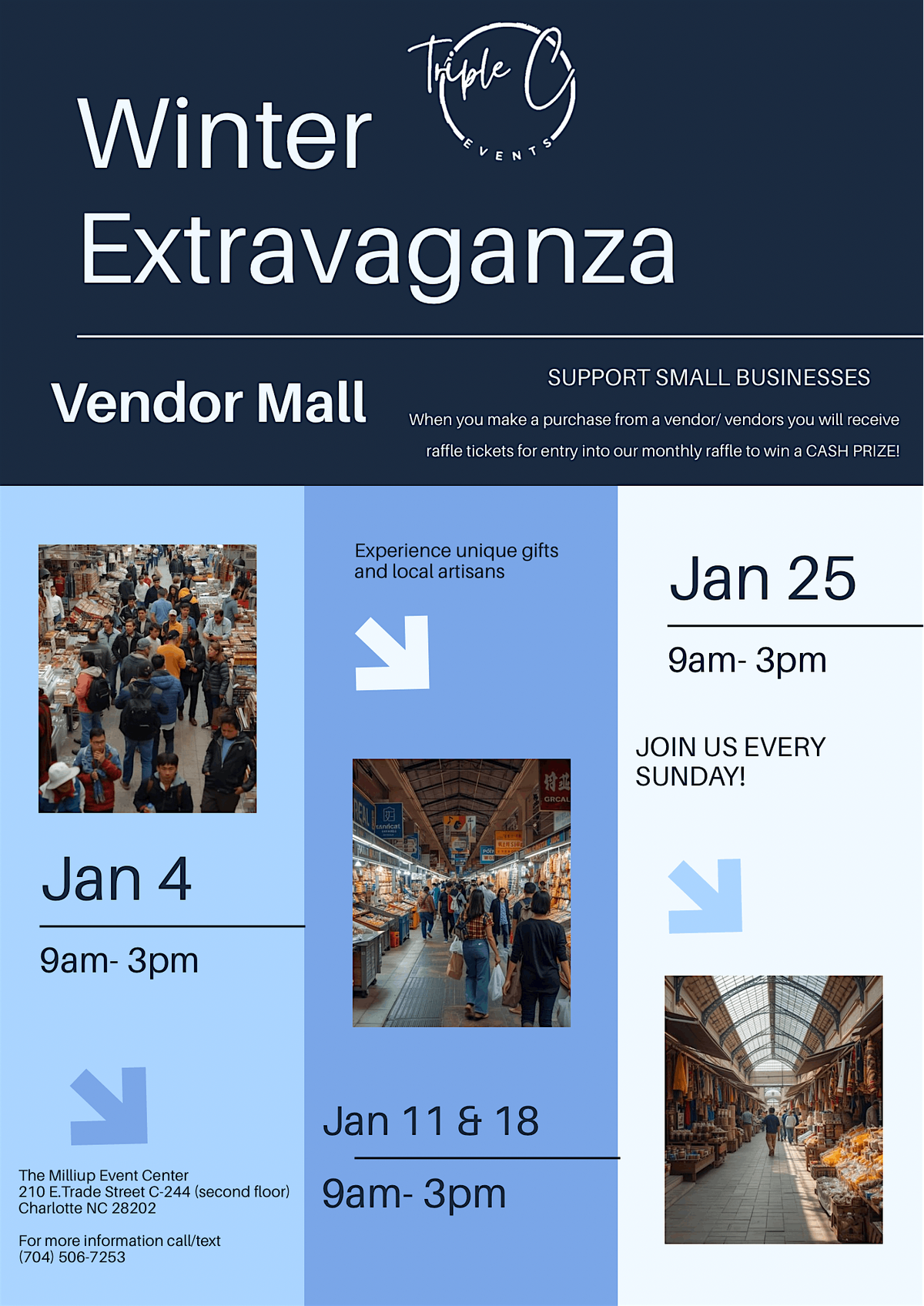 Join us EVERY SUNDAY IN JANUARY for a day filled with shopping, food, and fun. Explore a variety of vendors offering unique products and services.