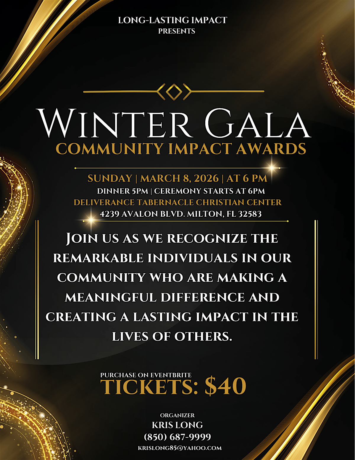 You are cordially invited to attend the Inaugural Winter Gala Community Impact Awards, presented by Long-Lasting Impact. Join us for a special evening as we recognize remarkable individuals in our community who are making a meaningful difference and creating a lasting impact in the lives of others. Celebrate with us as we honor those whose dedication, leadership, and compassion continue to strengthen our community and inspire positive change. The evening will feature our distinguished Eponymous Honor Awards, including: Murray Hamilton Leadership Award Gloria Mack Community Award Wayne Rushing Jr. Coaching Award Faith-Based Award