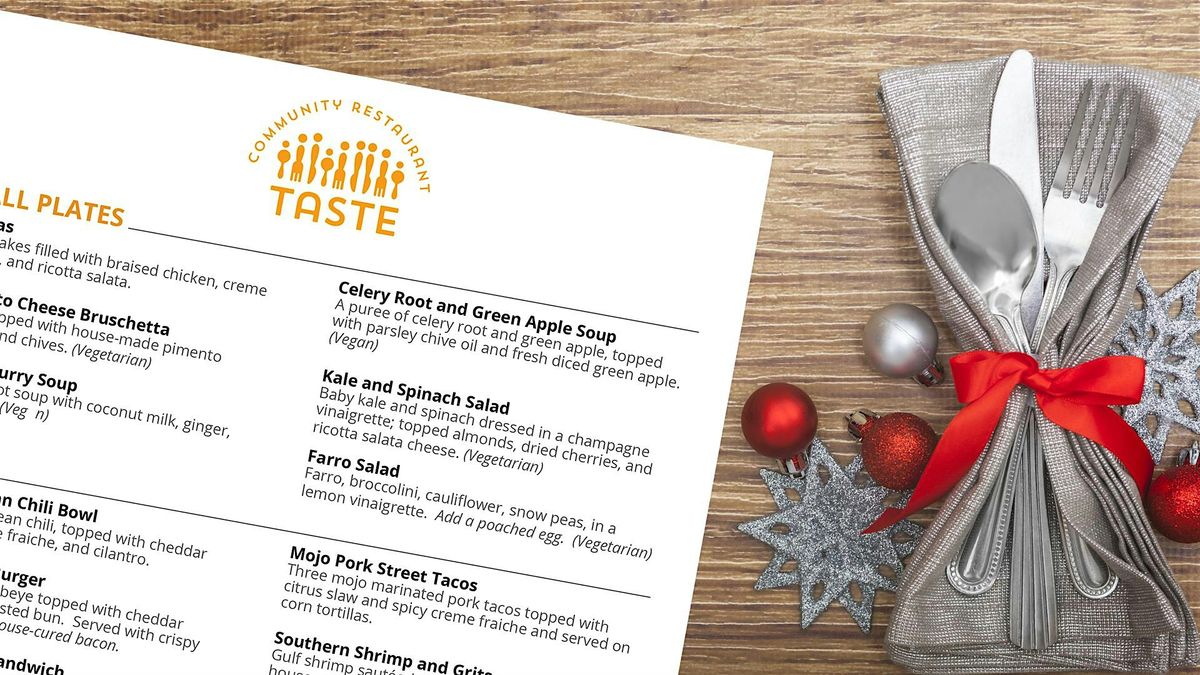Join Chef Jeff and the team as we explore our new Winter menu offering. Our menu changes as often as the seasons; this is your chance to be the first to taste and see what Winter will bring at Taste Community Restaurant.