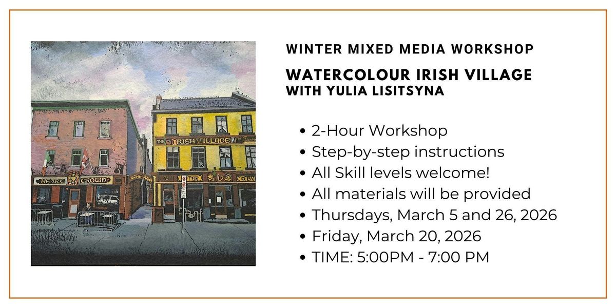 This 1.5 to 2-hour workshop invites attendees to explore the magic and vibrancy of an Irish Village in downtown Ottawa, one of the city’s oldest historic neighbourhoods. Every building and street corner carries memories from generations of Irish workers who contributed greatly to the growth of Ottawa and Canada. In this session, students will work on rare black watercolour paper by Van Gogh, supplied by Wallack’s, and experiment with a combination of watercolour and soft-body acrylic paints. Through guided instruction, you will explore contrast, layering, and texture to bring this historic setting to life.