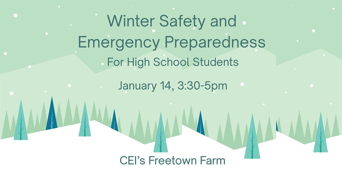 Winter Safety & Emergency Preparedness workshop for high school students on Wednesday, January 14, 2025, from 3:30pm to 5:00pm, at Community Ecology Institute's Freetown Farm. Get prepared for winter storms, winter play, and healthy winter eating. Participants will receive student service learning (SSL) hours. Register as soon as possible as space is limited to 20 participants!