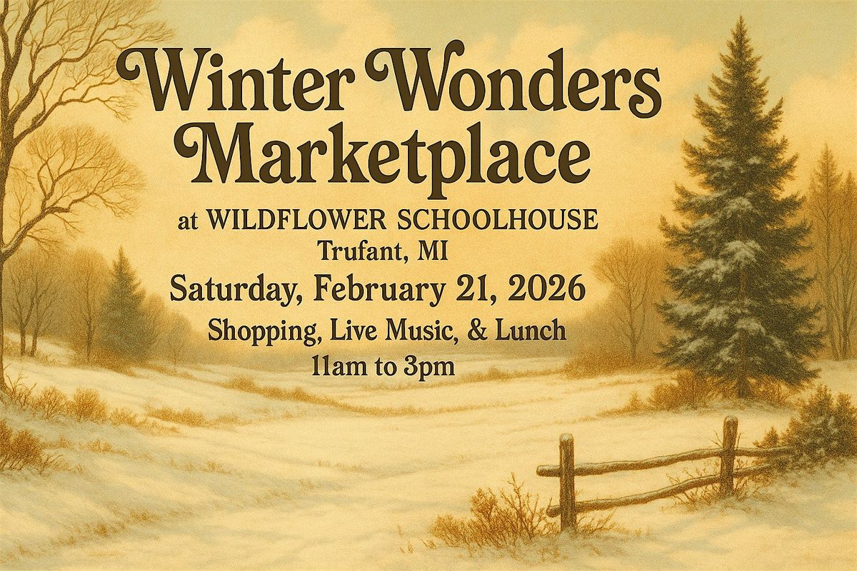 Shop for one-of-a-kind treasures made right here in Michigan at the Winter Wonders Marketplace coming to Wildflower Schoolhouse in Trufant, MI. 11am to 3pm on Saturday February 21, 2026. Featuring vendors offering a wide variety of unique crafts, handmade items, and vintage goods. Enjoy lunch and live music while you shop. $55 to participate as a vendor. Free to attend as a shopping guest. 11am to 3pm. We hope to see you there!