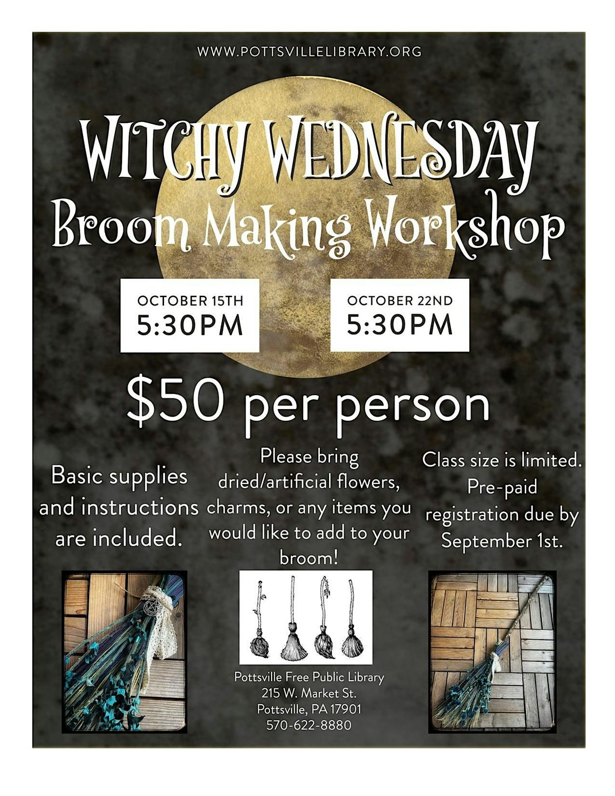 Fly through witchy season on a brand new handmade broom! This year we are offering two classes, one on Wednesday, October 15th at 5:30PM, and one on Wednesday, October 22nd at 5:30PM. The class includes basic supplies including broomstick, broomcorn, twine, and full instruction. You are encouraged to bring dried/artificial flowers, charms, ribbons, or whatever you'd like to decorate your custom broom. Class size is limited, so get your tickets early! Pre-paid registration is due by September 1st. Cost is $50 per person.