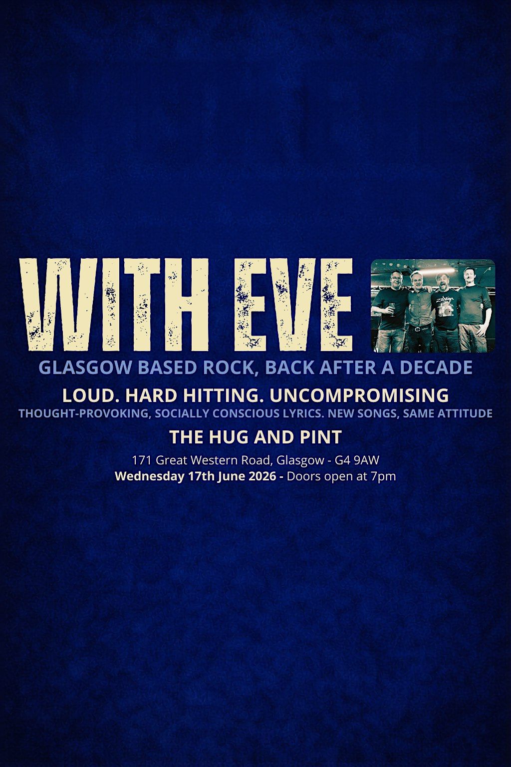 "With Eve return! The Glasgow-based rock band are live at The Hug and Pint, Wednesday 17 June 2026, delivering their unique mix of melodic, rhythm-driven guitar work with bite and hard-hitting, thought-provoking, socially conscious lyrics. New songs, same attitude!