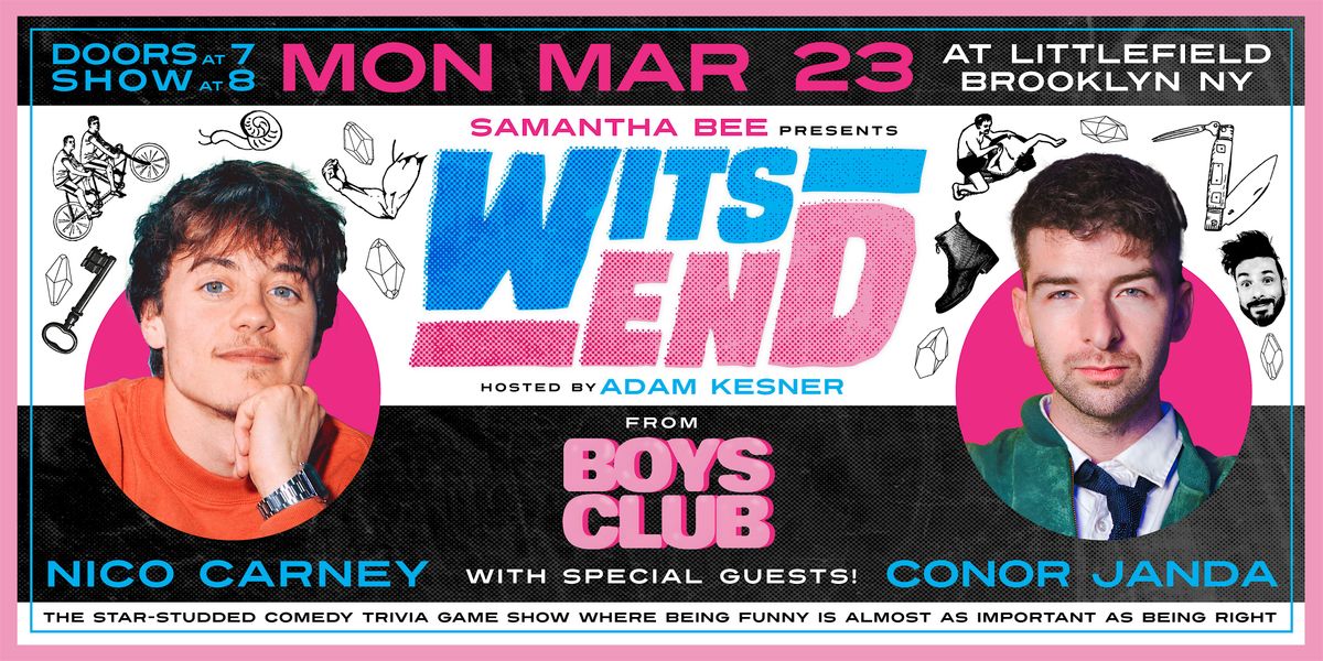 From the podcast and web series Boy’s Club, Nico Carney (Seth Meyers, She’s the He SXSW) and Conor Janda (Comedy Central, Vulture) bring their beautifully unhinged brains to WITS END, the live comedy trivia game show presented by Samantha Bee and hosted by Adam Kesner, where comedians compete in trivia tailored specifically to their weird little niches.