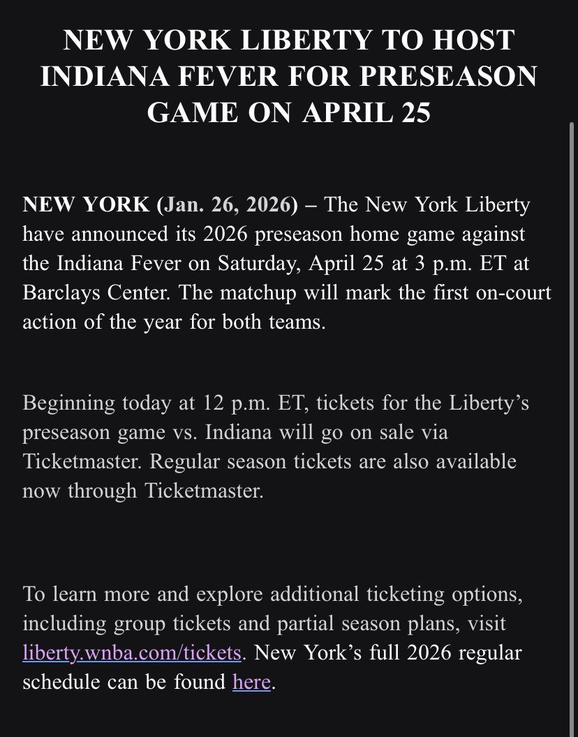✨ Discover the extraordinary at WNBA Preseason: New York Liberty vs. Indiana Fever, where magic meets reality in ways you've never imagined! 🏛️ Set in Barclays Center nestled in bustling Brooklyn, NY, this event promises to be a landmark occasion. 📅 Taking place on April 24th, 2026 at 07:00 PM, it's going to create an atmosphere where every moment becomes a cherished memory. 🌟 Immerse yourself in an experience crafted with attention to every detail, designed to surprise and delight at every turn. They have worked tirelessly to ensure this event exceeds all expectations, bringing together elements of entertainment, innovation, and pure joy. 🎊 Don't miss your chance to be part of this remarkable journey!http://maps.seatics.com/BarclaysCenter_BasketballRow_2025-02-07_2025-02-07_0631_02072025_064847_SVGC_tn.png